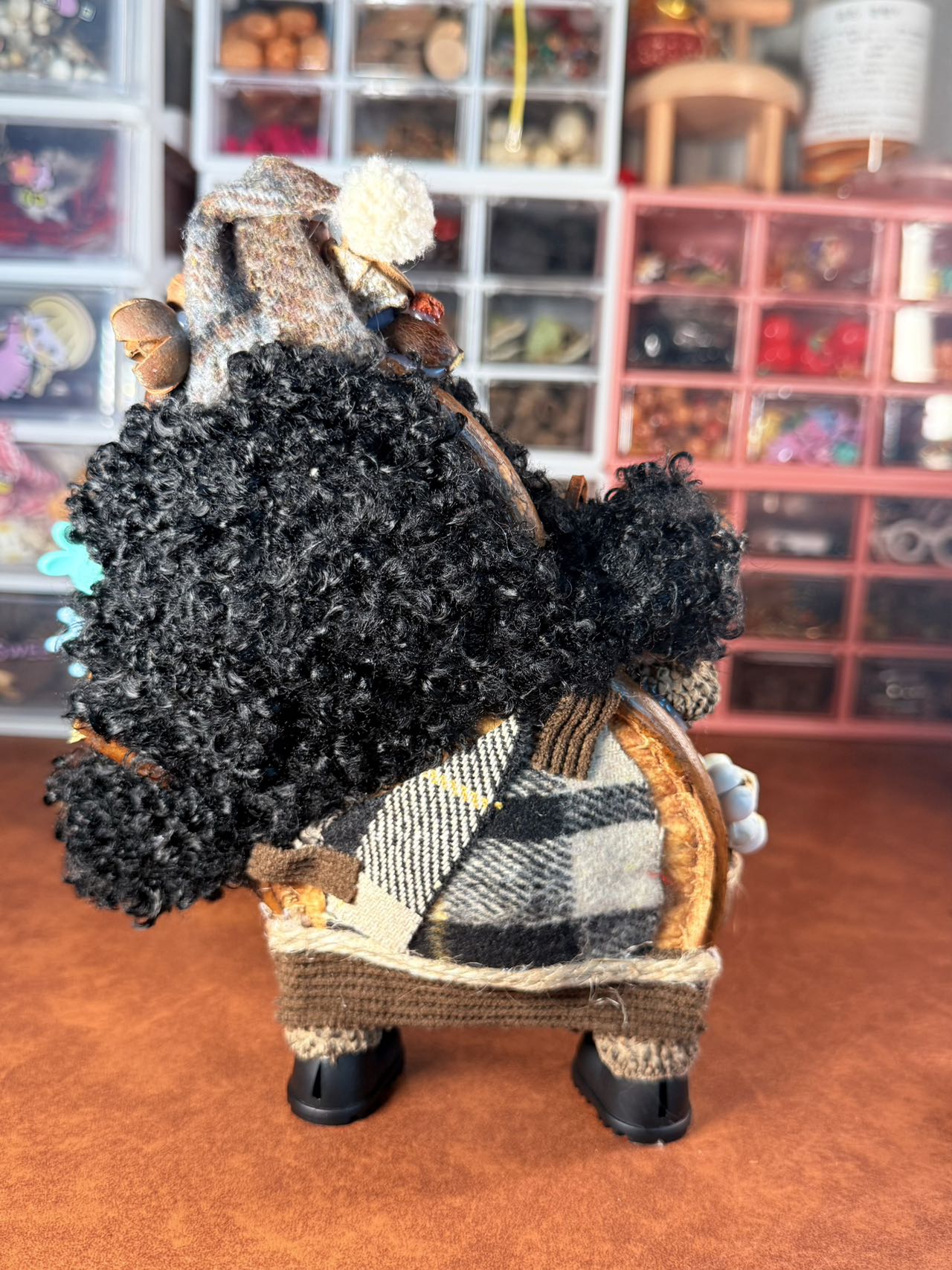 This handmade display doll features a whimsical little witch style with magnetic accessories that add extra playfulness. The mini flower vase and violin details make it a standout collectible for shelves and gift displays.