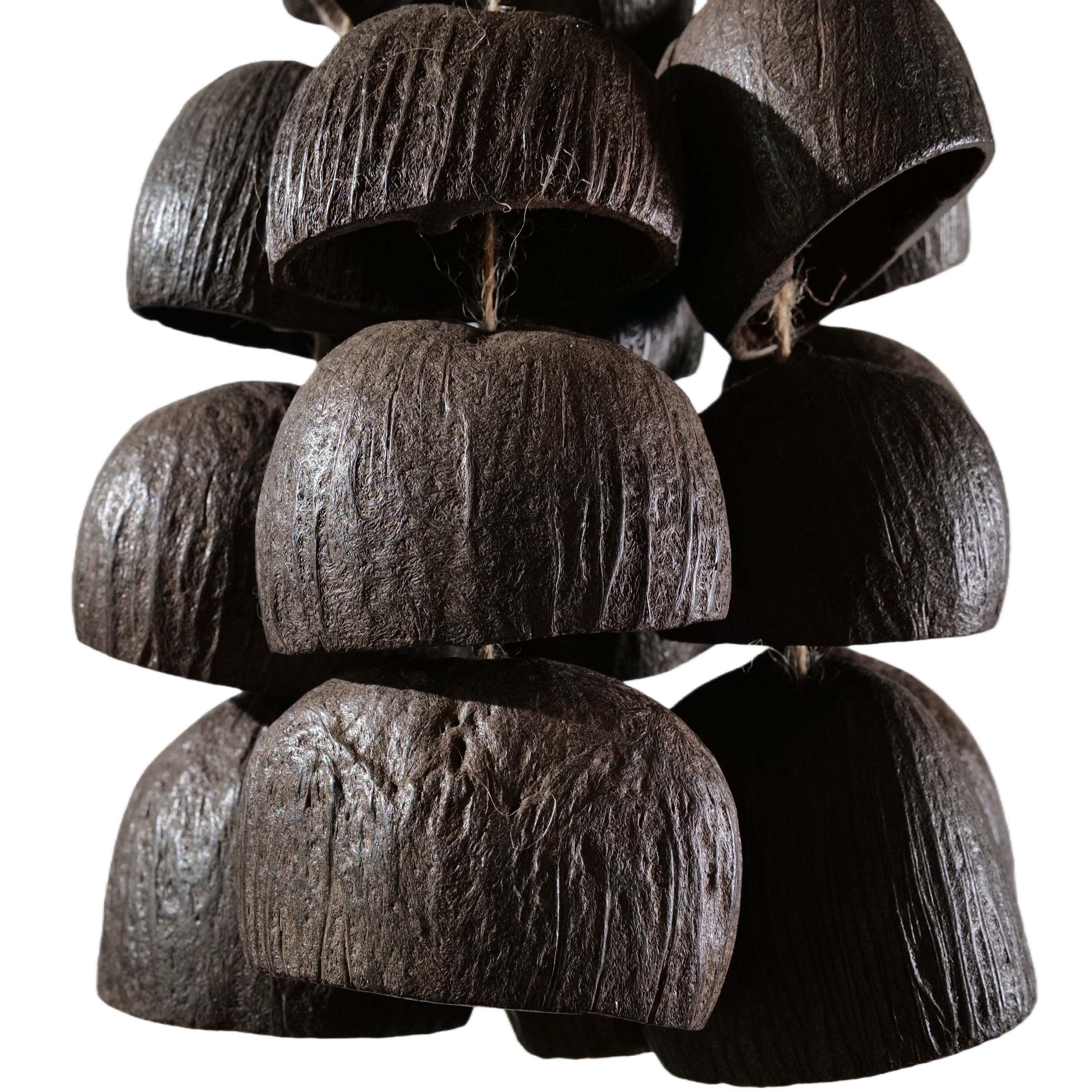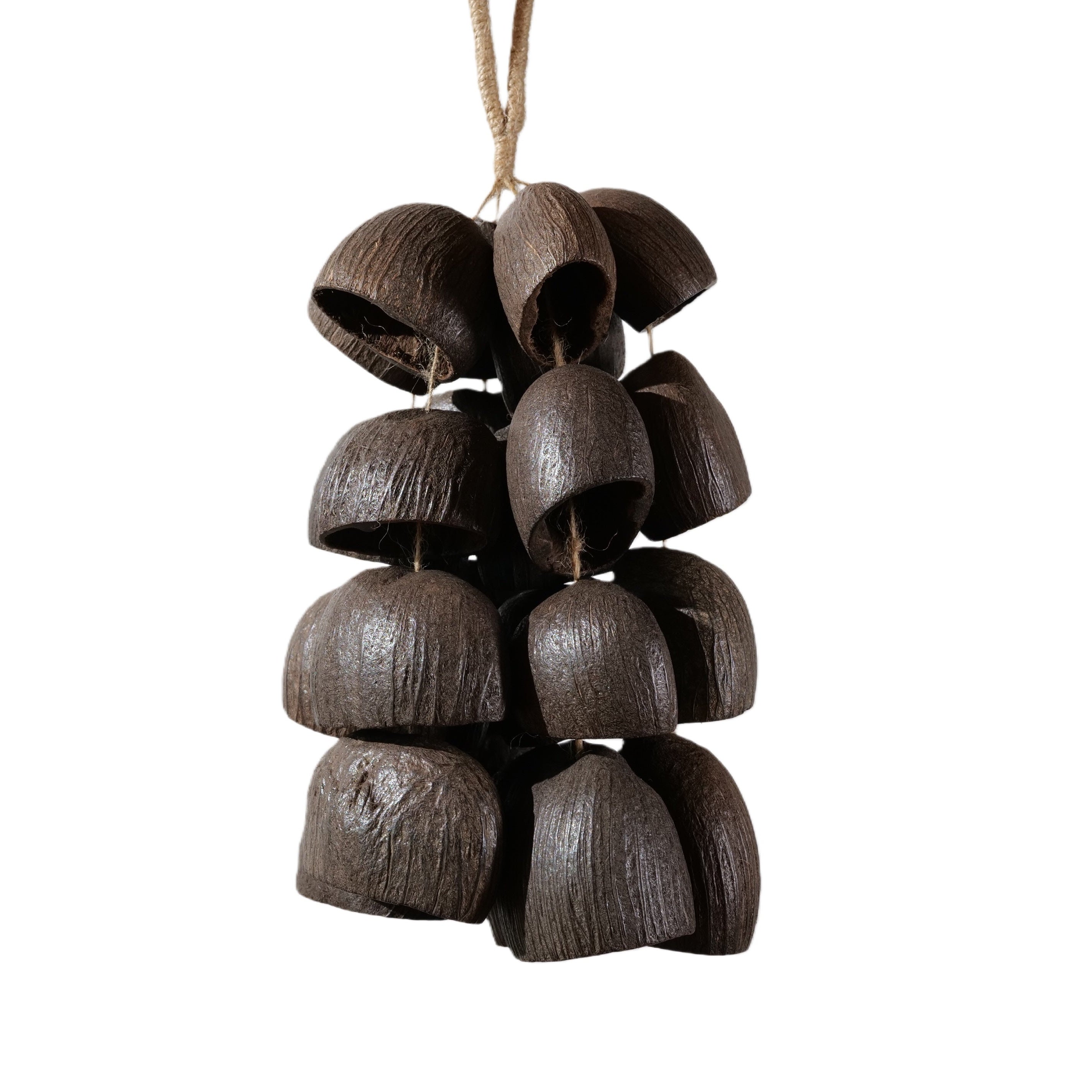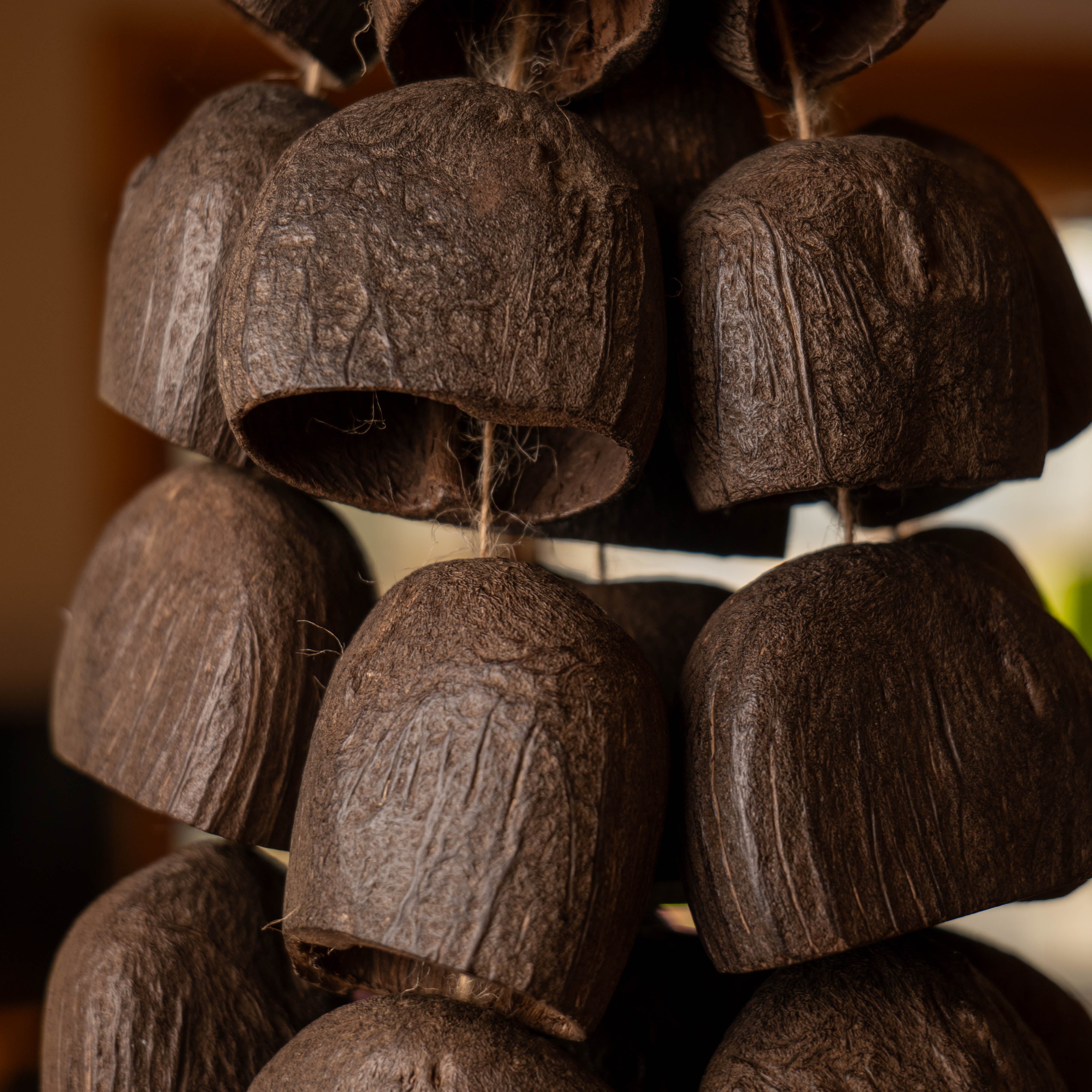 The Void is handcrafted from 24 authentic Salin nut shells — each one chosen for its density and grounded resonance. Hung by a window, near a doorway, or in your meditation corner, every passing breeze transforms into a soothing natural symphony.